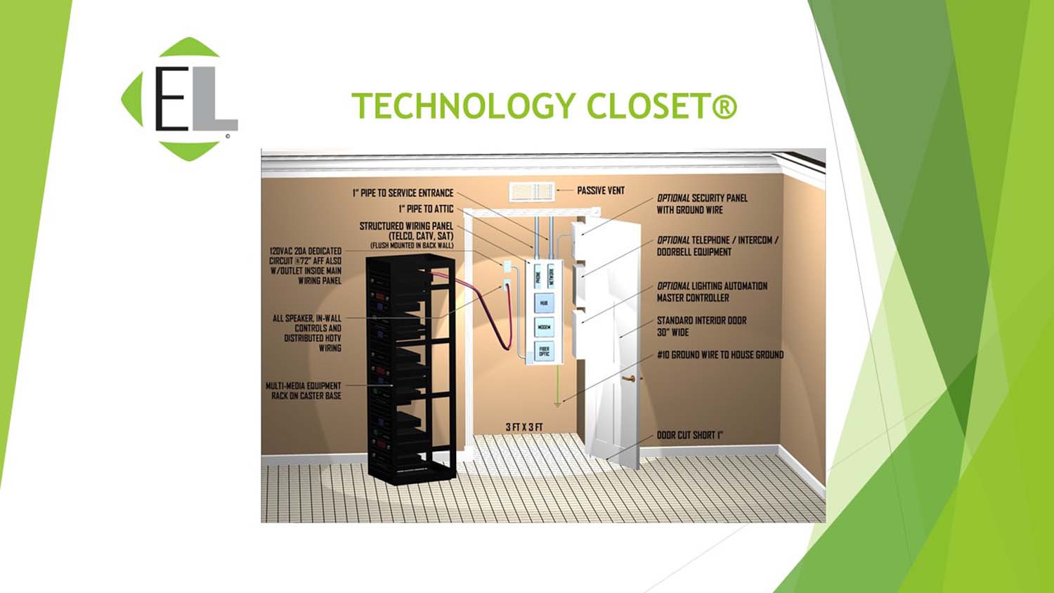 - Accommodates professional equipment racks for better cable management, improved security, and easier additions or changes. These racks also allow for transport of equipment during a move, so you can take your tech with you.